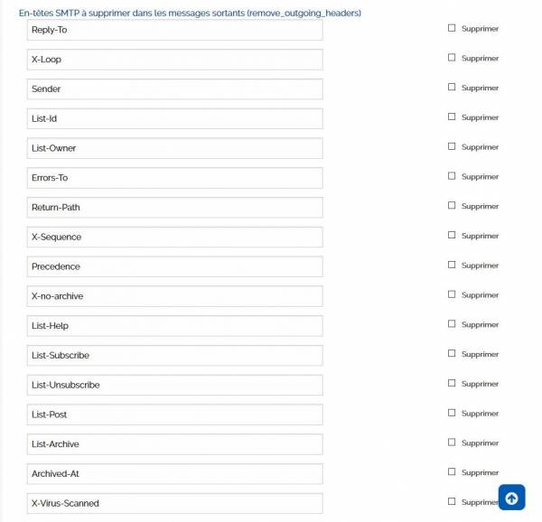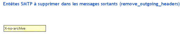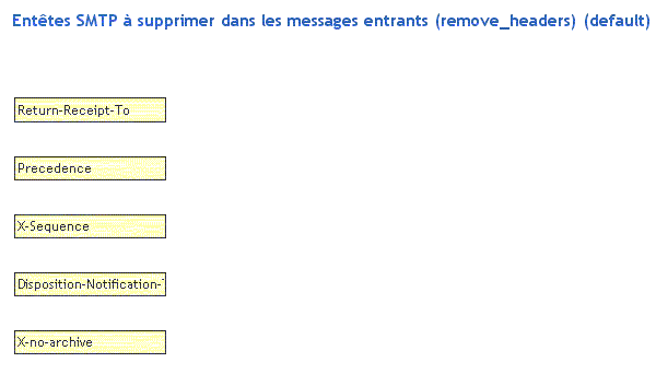 • En-têtes SMTP à supprimer dans les messages entrants (remove_headers) : Subject